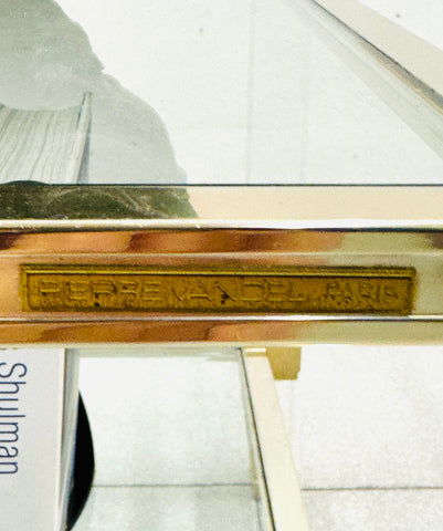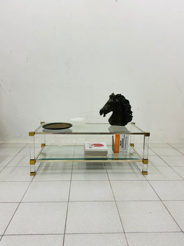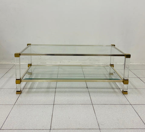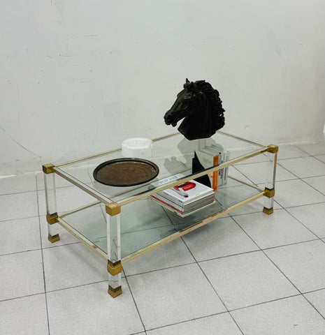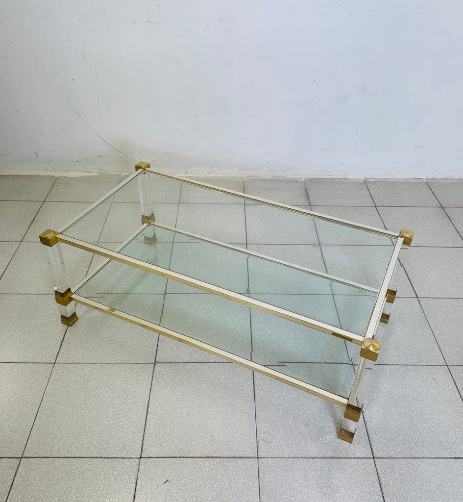 Gambe in plexiglass con particolari in metallo ottonato, ripiani in vetro e struttura in metallo.